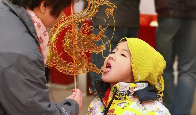 即使概率比较低,仍然会有转到龙的幸运儿。他们攥起拳头振臂高呼,在原地来回蹦跳,宣泄过激动的情绪后,会安静下来,与围观者一起屏息凝神,等待一条龙的诞生。糖画师傅也显得更加慎重,他用铁勺搅动着锅里的糖浆,眼神估量着石板的尺寸,在脑海里确定好龙首和龙尾的位置,便胸有成竹地下“笔”。此时铁勺就是糖画师傅的笔,糖浆是他的墨,意在笔先,不带有一丝迟疑。师傅腕间发力,随着淋、绕、提、拉动作的变化和勾连,龙首、龙躯、龙尾逐一呈现,用起子点上眼睛,在糖浆凝固前把竹签粘到龙身上,最后用铲刀从边缘处将糖画轻轻挑起,整个过程行云流水,一气呵成。小朋友们高举着他们的龙,像举着国王的权杖,迎着一众羡慕的眼神,昂首挺胸巡游几圈后,才心满意足地回家去。谁又舍得吃这么精致的艺术品呢?他们一路只会小心翼翼地舔几口,等到糖快化了才舍得吃掉。