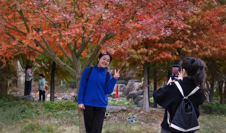 九峰村位于福州晋安区,漫山遍野的枫树叶色彩缤纷,在天地间交织错落,把这里变成了一处世外桃源。村口是九峰村党群服务中心,一旁的南阳溪沿着村落道路蜿蜒徐行,欢快地奔向远方。一座石桥横亘在溪流上,游人们来来往往,络绎不绝。我和家人来到石桥旁,只见对岸有两棵巨大的树拔地而起,一棵是火红热烈的枫香树,另一棵是嫩黄的多花蓝果树,吸引着众多游客以这两棵树为背景拍照打卡。