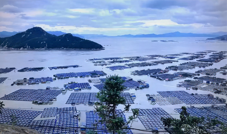行至码头,海的气息陡然浓烈。眼前是一片天然的避风港,海面上规整的彩色浮球整齐列阵,如同在蔚蓝画布上铺展开的“海上田园”。这就是井水村的“海上牧场”。浮球之下,深色的网箱里孕育着高价值的鲍鱼。阳光穿透云层,海面被染上碎金,每一枚浮球都在粼粼波光中闪耀,倒影随微波拉伸出颤动的色带。偶有渔船“突突”驶过,在这一方井然有序的海上疆域里划开一道白色涟漪,打破了画面的静谧,却又增添了耕海牧渔的生机。