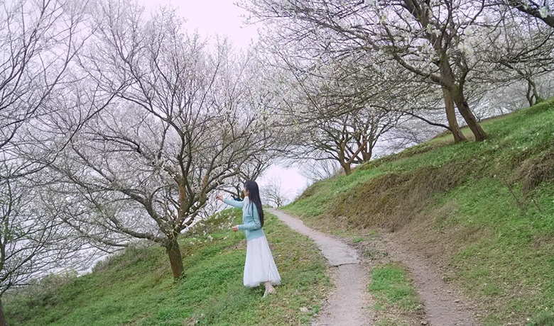 淳朴的乡民们用细碎的石子在林间铺设出一条条赏花小道。我们走在这小道上,两侧都是洁白如雪的梅花。这些青梅树都比较矮小,茂密的枝头上有着一串串花朵,它们就开在我们的头顶或肩头。我略一举臂就能触碰到它们明艳的花蕊,感受到它们顽强的生命力,欣赏到它们柔韧的姿容。