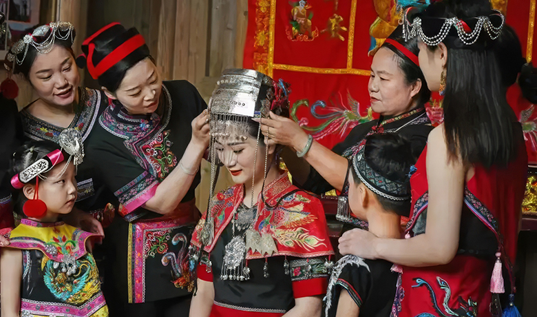 继续沿石板路前行,偶尔能瞥见村民家中悬挂的畲族服饰:蓝黑底色沉稳雅致,大红刺绣鲜活灵动,纹样繁复精美,或勾勒山水草木,或镌刻吉祥寓意,搭配精巧别致的银质头饰,每一处细节都彰显着畲族独有的审美韵味。