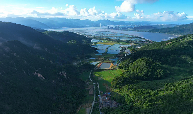 村落坐西朝东,背靠巍巍重阳山,面朝开阔蟛蜞洋。屋舍沿路带状分布,错落半隐在葱郁草木间。蓝天白云为底,青山绿树作衬,老房、石墙、新屋交织,宛如一幅古朴淡雅的山水画,静得能听见风穿林叶的声响。村间一片绿油油的豆尾苗鲜嫩欲滴,满眼清新生机。这里虽藏深山,却无闭塞之感,唯有安然与从容。漫步其间,时光仿佛都慢了下来,恰如陶公所言:“结庐在人境,而无车马喧。”心若向幽,何处不是桃源?