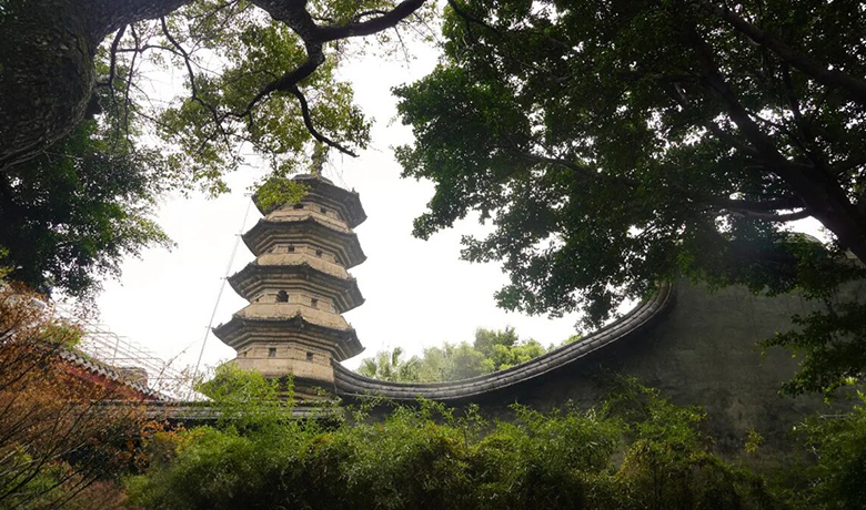 往乌山东麓走,远远就看见乌塔了。这座八角七层的石塔,在雨中显得格外沉稳。它始建于唐贞元十五年(799年),原名“崇妙保圣坚牢塔”,因塔身由花岗岩青石砌成、呈乌黑色,故称乌塔。五代闽永隆三年(941年),闽王王审知第七子王延曦准备在旧址上重建九层宝塔,才建到七层,王延曦便被臣属所杀,工程就此告终。