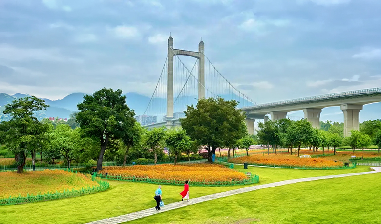 我驱车经过鼓山大桥时,晨曦正悄悄拨开云翳,将一缕温柔的光洒向大地。我凭栏俯瞰,整座公园宛如一幅渐渐铺展的长卷,色彩斑斓,美得令人心醉。黛青色的闽江,碧波微微荡漾,像是在轻声吟唱着春的歌谣;翠柳织就的烟罗,轻柔地拂过堤岸,恍若“拂堤杨柳醉春烟”的意境。油菜花在春风中掀起金色波浪,那花海倒映着水池中“福骏奔腾”的铜雕,恍若八匹神驹正踏着碎金逐日而去,灵动而富有力量。公园栈道蜿蜒处,几点朱红亭角时隐时现,恰似绣娘失手遗落的胭脂,为这幅画卷增添了几分娇俏。
