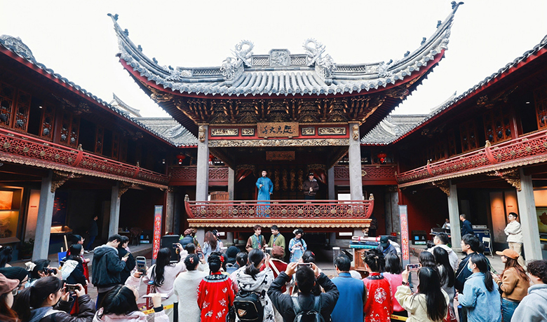 历史的风烟,曾在此刻下别样印记。抗战胜利后,会馆变身为“皇宫酒家”,衣香鬓影间,是一段喧嚣而短暂的过往。如今,戏台旁的电子屏循环播放着会馆的修缮历程,曾经的议事大堂,成了闽浙文化交流的展厅,墙上的老照片里,木商们的身影坚毅,“皇宫酒家”的菜单复刻件,让人恍若窥见当年的繁华。