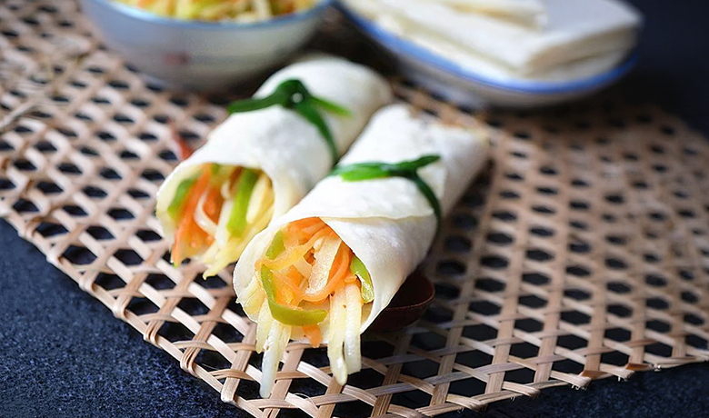 福州咬春,最基本的款式是吃春卷,由更古老的吃春饼演化而来。东晋时期,人们在春日以面粉擀制成薄饼,搭配蔬菜食用,名为春饼,又称春盘。唐代杜甫诗句“春日春盘细生菜”,画面感十足,读来备感亲切。后来,福州人又将馅料卷入薄饼油炸。传说宋代有书生带此干粮赶考,考中后送与考官分享。考官赞不绝口,称之为春卷。福州春卷由此名声大振,狭义上的咬春,便是吃春卷。