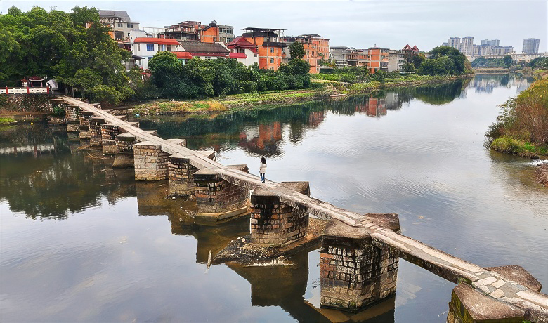 合浦桥周边和桥上环绕着3 株百年古榕。其中一株古榕盘根错节地生长在桥墩之上,繁茂的枝叶宛如绿色巨伞,遮盖呵护着“伞”下的合浦桥。地龙般的树根在桥下蜿蜒20多米,贯通全桥,与桥面石板和石墩紧紧合抱,融为一体,颇有一番“缠绵之美”,被人们形象戏称为“骑桥榕”。另两株古榕经历数百年风霜,苍翠葱郁,枝干纵横交错,似结连理。人在树下,树在桥上,桥在水中。合浦桥人、桥、树、水和谐交融,让人观之不觉进入天人合一的境界中,陶醉景中回味无穷。
